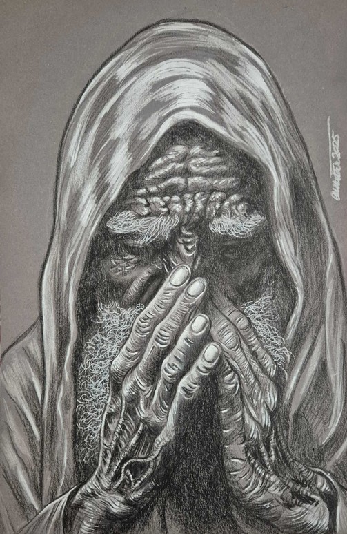 176 - Studio di viso di vecchio con cappuccio - Matite colorate su cartoncino - 21x29,5 cm